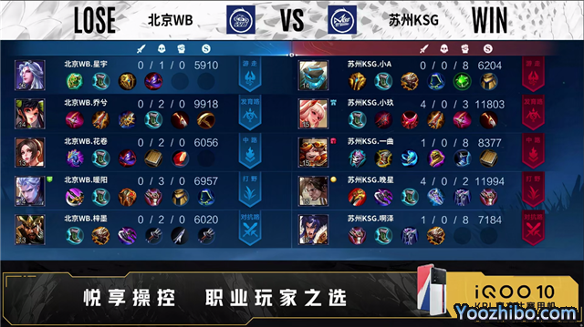 第一局双方常规开局。3分30秒苏州KSG对抗路击杀关羽拿下一血。4分01秒苏州KSG摧毁敌方对抗路外塔。5分16秒北京WB拿下暴君。5分35秒中路团苏州KSG打出0换2,随后摧毁敌方中路外塔。7分17秒北京WB摧毁敌方发育路外塔。7分50秒苏州KSG野区击杀铠。8分02秒苏州KSG摧毁敌方发育路二塔。8分37秒苏州KSG拿下先知主宰。9分30秒野区团苏州KSG击杀铠。10分27秒苏州KSG拿下暗影主宰。11分34秒苏州KSG摧毁敌方中路二塔。11分58秒苏州KSG摧毁敌方发育路高地塔。12分22秒苏州KSG拿下暗影暴君。13分02秒苏州KSG告破敌方三路外塔。13分25秒对抗路团苏州KSG打出0换5团灭对手。14分02秒苏州KSG摧毁敌方水晶拿下比赛。