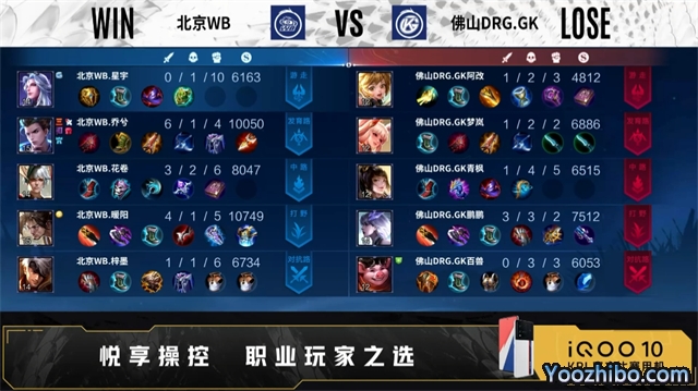 开局北京WB边射换线。1分06秒中路北京WB击杀姜子牙,拿下一血。2分27秒北京WB拿下暴君,发育路北京WB击杀姜子牙,打出2换1。5分31秒对抗路佛山DRG.GK击杀不知火舞,打出0换2,北京WB摧毁敌方发育路外塔。7分23秒北京WB摧毁敌方对抗路外塔,拿下主宰,佛山DRG.GK摧毁敌方发育路外塔。8分38秒河道佛山DRG.GK击杀蒙恬,打出0换3,摧毁敌方中路外塔。10分42秒对抗路佛山DRG.GK击杀马可波罗,打出0换2。11分10秒野区北京WB曜三连决胜,佛山DRG.GK吕布二连击破,打出2换4。12分46秒佛山DRG.GK拿下暗影主宰,发育路北京WB击杀刘邦,摧毁敌方发育路二塔。15分01秒佛山DRG.GK拿下暗影暴君。15分40秒佛山DRG.GK摧毁敌方发育路二塔,野区北京WB击杀姜子牙,打出0换4,摧毁敌方对抗路二塔、高地,击杀澜,团灭对手摧毁水晶拿下比赛。
