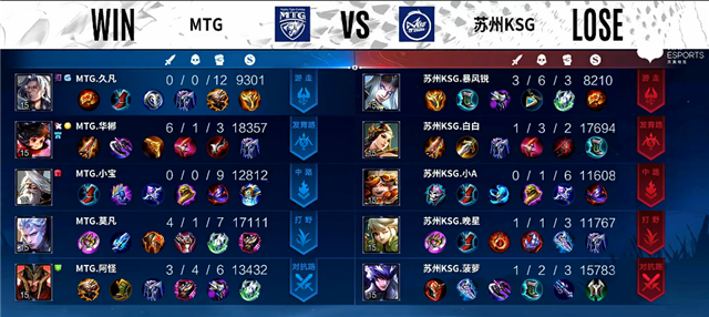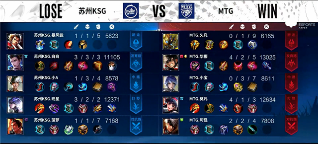 2分17秒镜拿下暴君。5分20秒镜拿下一血。5分40秒苏州KSG推掉双边一塔。7分40秒镜拿下暴君。8分钟中路团战,MTG打出3换4。9分钟蒙犽推掉中路一塔。9分27秒蒙犽拿下主宰。10分30秒下路团战,苏州KSG打出1换2。11分钟镜拿下暴君。13分钟中路团战,苏州KSG打出0换2。13分46秒狄仁杰推掉中路一塔。14分50秒娜可露露拿下暴君。15分10秒中路团战,MTG打出1换4。15分57秒娜可露露推掉中路高地塔。16分09秒MTG推掉水晶拿下本场比赛胜利。