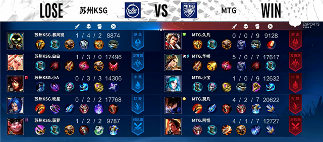 开局苏州KSG入侵野区,太乙真人拿下一血。2分41秒野区团战,猪八戒被击杀。3分30秒橘右京拿下暴君。5分钟澜单杀橘右京。6分10秒下路团战,太乙真人被击杀。6分40秒橘右京拿下主宰。6分50秒虞姬推掉下路一塔。8分钟下路团战,MTG打出0换2。8分30秒澜拿下暴君。10分40秒澜拿下主宰。11分钟虞姬推掉中路一塔。15分钟澜拿下主宰,橘右京拿下暴君。17分钟周瑜推掉中路一塔。18分55秒公孙离拿下暴君,吕布被击杀。19分25秒橘右京拿下主宰。21分钟风暴龙王团,MTG打出0换2。21分55秒澜拿下风暴龙王。25分45秒中路团战,MTG团灭苏州KSG 。26分16秒MTG推掉水晶率先拿下赛点。