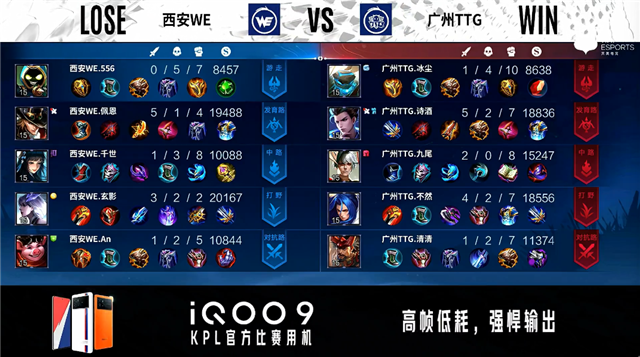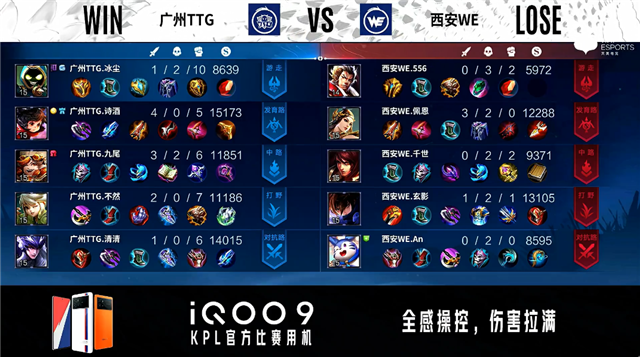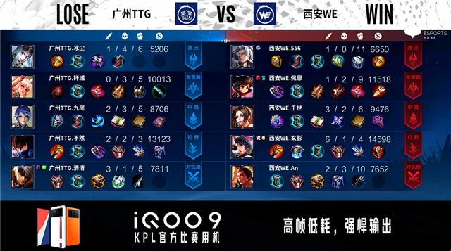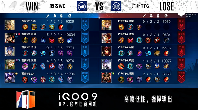 开局广州TTG入侵野区反掉蓝BUFF。2分43秒野区击杀张飞拿到一血。4分16秒主宰处团战双方1换1。7分25秒广州TTG拿下暴君。8分27秒西安WE对抗路击杀裴擒虎。6分47秒西安WE拿下主宰。9分31秒西安WE摧毁敌方中路外塔。9分47秒广州TTG中路击杀牛魔。10分17秒广州TTG拿下暗影暴君。10分53秒广州TTG拿下暗影主宰。11分56秒广州TTG中路击杀关羽。12分52秒广州TTG摧毁敌方发育路二塔。14分24秒西安WE中路击杀不知火舞。15分01秒西安WE摧毁敌方中路二塔。17分40秒西安WE中路击杀虞姬。18分07秒广州TTG摧毁敌方发育路二塔。20分29秒广州TTG抢到风暴龙王并打出2换5。22分18秒广州TTG摧毁敌方对抗路高地塔。22分36秒中路团战西安WE击杀猪八戒。23分53秒广州TTG拿下风暴龙王,团战广州TTG打出1换2。24分26秒西安WE摧毁敌方发育路高地塔。25分36秒高地团战广州TTG击杀牛魔并摧毁中路高地塔。27分23秒西安WE拿下风暴龙王并打出0换2。28分36秒西安WE摧毁敌方水晶拿下比赛。
