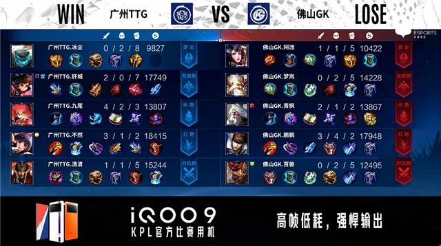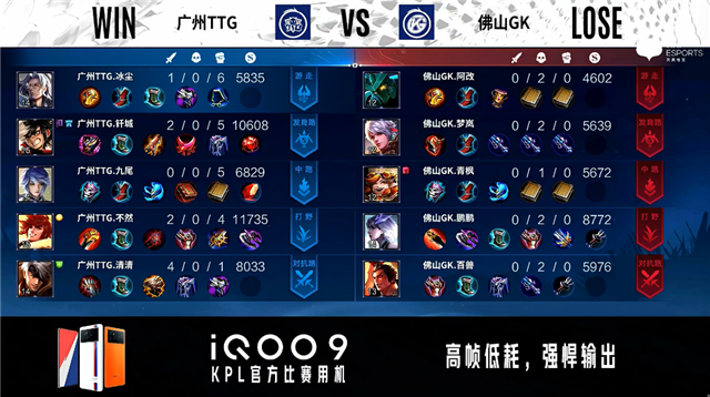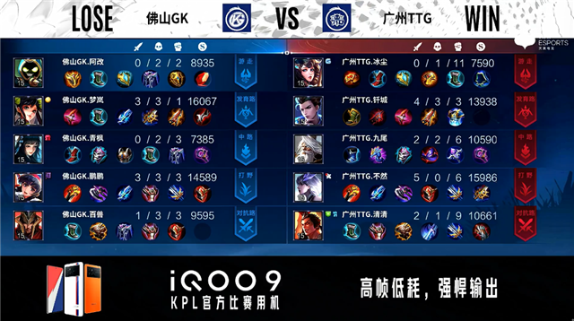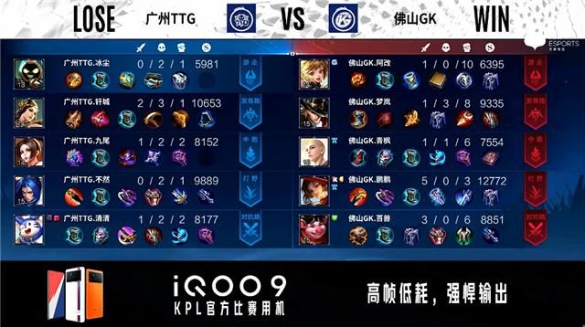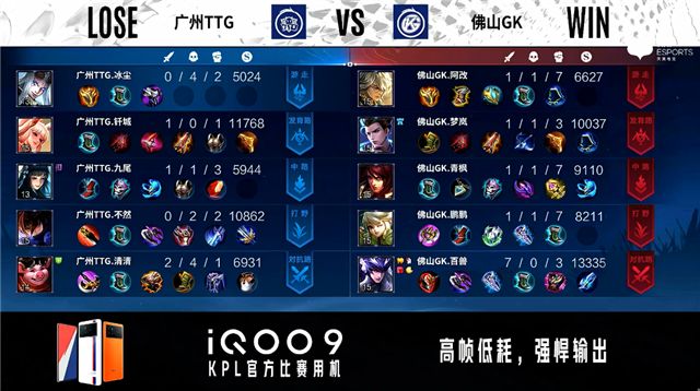 开局广州TTG入侵野区拿下蓝BUFF。2分28秒佛山GK野区击杀橘右京。3分41秒佛山GK拿下主宰。4分06秒广州TTG对抗路击杀马可波罗。6分39秒广州TTG拿下暴君。8分38秒广州TTG拿下主宰。10分15秒野区团战佛山GK打出2换3。10分51秒佛山GK拿下暗影主宰。11分42秒佛山GK野区击杀虞姬。12分03秒佛山GK发育路打出0换2。12分26秒佛山GK摧毁敌方中路二塔。12分42秒广州TTG摧毁敌方中路高地塔。13分58秒中路团战佛山GK击杀虞姬。14分20秒对抗路双方1换1。14分35秒高地团战佛山GK打出0换2。14分48秒佛山GK摧毁敌方水晶拿下比赛。