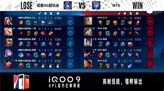 双方和平开局。4分10秒,成都AG超玩会控下暴君。5分15秒,成都AG超玩会马可波罗击杀周瑜拿下一血。5分45秒,MTG破掉成都AG超玩会上一塔,成都AG超玩会破掉MTG下一塔。6分06秒,成都AG超玩会娜可露露击杀公孙离。6分30秒,双方团,成都AG超玩会打出1换3,马可波罗拿下双杀。9分03秒,成都AG超玩会破掉MTG中一塔。9分35秒,成都AG超玩会破掉MTG上二塔。9分57秒,双方团,成都AG超玩会击杀夏侯惇。10分55秒,成都AG超玩会控下暗影主宰。11分46秒,成都AG超玩会娜可露露上路单杀暃。12分10秒,成都AG超玩会摧毁MTG上高地并击打出0换3。12分20秒,成都AG超玩会摧毁MTG水晶率先拿到赛点。