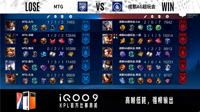 1分24秒,双方团战1换1。2分24秒,MTG控下暴君。3分50秒,上路团,MTG打出1换2。5分38秒,MTG击杀蒙恬,随后破掉成都AG超玩会上一塔。7分25秒,MTG团战打出1换2,成都AG超玩会控下暴君。7分47秒,双方团战1换1。9分41秒,成都AG超玩会破掉MTG中一塔,随后控下先知主宰。10分25秒,成都AG超玩会击杀鲁班七号,随后破掉MTG中二塔。12分35秒,成都AG超玩会破掉MTG中高地,随后团战打出1换5团灭对手。12分53秒,成都AG超玩会一波摧毁MTG水晶赢下比赛。