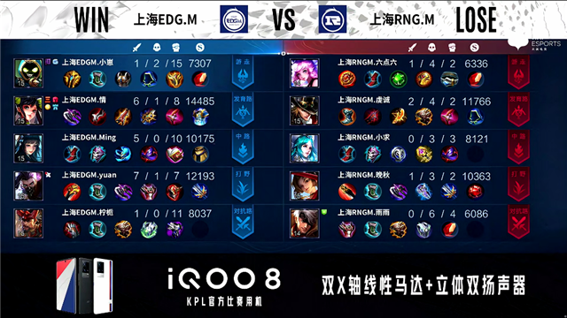 50秒,上海EDG.M吕布上路击杀猪八戒拿下一血,随后团战双方1换1。1分50秒,上海RNG.M下路击杀李元芳。2分16秒,上海RNG.M控下暴君。2分51秒,上海EDG.M下路击杀蒙犽。5分54秒,上海RNG.M澜击杀盘古,随后破掉上海EDG.M上一塔。6分30秒,双方团战1换1。7分03秒,上海EDG.M控下暴君。7分46秒,上海EDG.M击杀澜。9分19秒,野区团,上海EDG.M打出2换3。9分57秒,上海RNG.M破掉上海EDG.M中一塔。10分38秒,上海RNG.M控下暗影暴君。11分36秒,上海EDG.M秒掉嬴政。12分33秒,上海RNG.M团战打出0换2,随后破掉上海EDG.M中二塔。13分04秒,上海RNG.M破掉上海EDG.M下二塔。14分05秒,上海RNG.M破掉上海EDG.M上二塔。15分04秒,上海RNG.M控下暗影暴君。15分45秒,上海RNG.M越高地打出0换3并破掉上海EDG.M下高地。16分07秒,上海RNG.M击杀剩余两人团灭对手,一波摧毁上海EDG.M水晶先下一城。