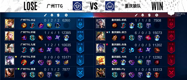 双方和平开局。2分10秒暴君团,艾琳拿下一血,广州TTG打出0换2,镜拿下暴君。4分10秒下路团战,艾琳被击杀。4分50秒弈星抢下主宰。5分17秒艾琳推掉下路一塔。6分17秒双方互换边路一塔。7分钟盘古拿下暴君。10分20秒暴君团,重庆狼队打出0换4,重庆狼队推掉中路防御塔。12分10秒中路团战,艾琳被击杀。13分钟盘古拿下暴君。14分47秒虞姬推掉上路高地塔。17分22秒虞姬拿下暴君。18分08秒盘古拿下主宰。19分钟虞姬推掉中路高地塔。20分40秒野区团战,重庆狼队打出0换2。21分04秒重庆狼队推掉水晶追平比分。