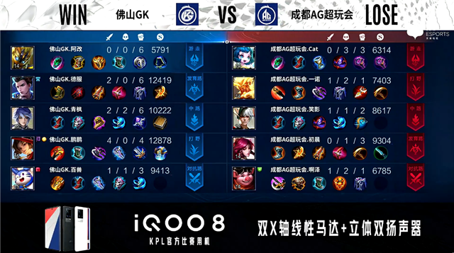 开局成都AG不知火舞走对抗路、廉颇走中路,佛山GK嬴政走发育路、公孙离走中路。2分13秒佛山GK抢到主宰。8分14秒佛山GK摧毁敌方中路外塔。10分14秒佛山GK拿下暗影暴君。11分53秒佛山GK拿下暗影主宰。13分06秒佛山GK中路击杀不知火舞拿到一血。13分17秒佛山GK摧毁敌方中路二塔。13分38秒佛山GK野区击杀大乔。14分07秒佛山GK摧毁敌方对抗路高地塔,团战双方打野互换。15分11秒成都AG拿下暗影暴君。16分14秒佛山GK拿下暗影主宰。18分06秒发育路团战成都AG打出0换2,佛山GK摧毁敌方发育路高地塔。18分53秒双方中路1换1。20分49秒佛山GK野区击杀不知火舞。21分24秒野区团战佛山GK打出0换4。21分43秒佛山GK团灭对手摧毁水晶拿下比赛。