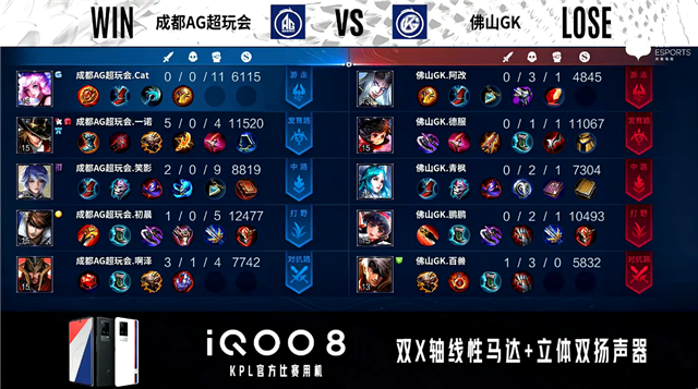 开局成都AG边路换线。2分14秒佛山GK拿下暴君。3分09秒野区团战成都AG击杀橘右京拿到一血。5分25秒双方野区1换1。6分13秒成都AG野区击杀橘右京。6分23秒成都AG摧毁敌方对抗路二塔并拿下暴君。8分10秒成都AG摧毁敌方中路外塔。8分23秒成都AG拿下主宰。9分22秒双方边路1换1。10分13秒成都AG拿下暗影暴君。12分56秒成都AG摧毁敌方中路二塔。13分42秒成都AG高地团战打出0换3摧毁敌方水晶拿下比赛。