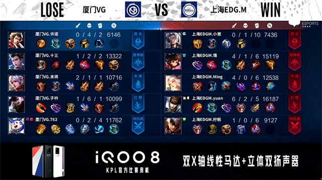 双方常规开局。1分32秒厦门VG主宰处击杀兰陵王拿到一血。2分43秒上海EDG.M拿下暴君,厦门VG击杀兰陵王。4分34秒暴君处团战厦门VG击杀廉颇。7分33秒厦门VG暴君处击杀廉颇。9分10秒厦门VG拿下主宰。10分19秒厦门VG抢到暗影主宰。11分27秒中路团战厦门VG打出0换2。12分11秒厦门VG拿下暗影暴君。12分45秒厦门VG暴君处击杀娜可露露。14分44秒厦门VG发育路打出1换2。15分24秒厦门VG拿下暗影主宰。16分09秒厦门VG野区击杀娜可露露。17分35秒厦门VG野区打出0换2。18分10秒高地团战厦门VG打出0换5。18分30秒厦门VG摧毁敌方水晶拿下比赛。