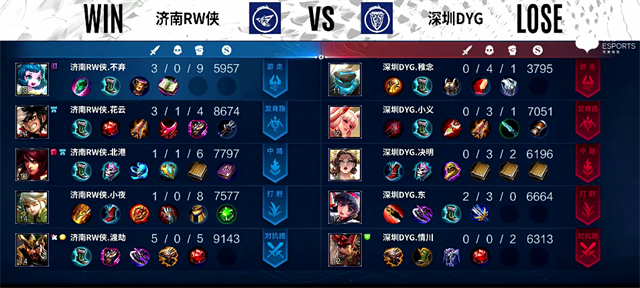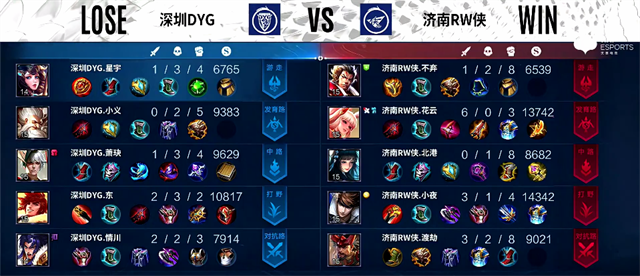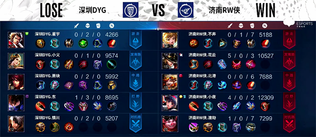 双方和平开局。4分20秒娜可露露拿下主宰,虞姬推掉下路一塔。4分45秒澜拿下暴君。5分30秒娜可露露拿下一血。6分20秒马可波罗推掉上路一塔。8分钟上路团战,双方1换1。9分钟娜可露露拿下暴君。9分39秒娜可露露单杀澜。10分30秒猪八戒推掉中路一塔。10分40秒娜可露露拿下暴君。11分30秒夏侯惇被击杀,济南RW侠推掉上路二塔。11分40秒张飞被击杀。12分50秒娜可露露拿下主宰。13分33秒济南RW侠推掉中路和上路高地塔。13分50秒高地团战,济南RW侠团灭深圳DYG,济南RW侠推掉水晶率先拿下一分。