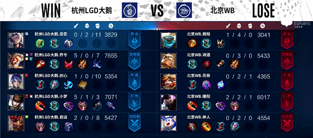 双方和平开局。2分15秒兰陵王拿下暴君,赵云拿下主宰。3分50秒下路团战,弈星拿下一血,杭州LGD大鹅打出0换2。4分10秒黄忠推掉下路一塔。6分钟黄忠推掉上路一塔。6分30秒梦奇拿下暴君,团战杭州LGD大鹅团灭北京WB。7分15秒黄忠推掉中路一塔。8分钟赵云拿下主宰。8分40秒上路团战,杭州LGD大鹅打出2换5团灭北京WB,9分11秒杭州LGD大鹅推掉水晶率先拿下赛点。