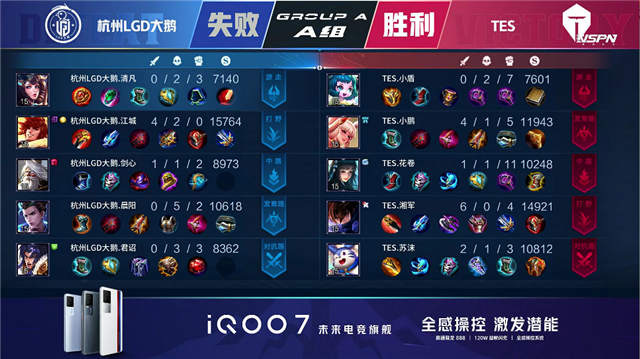 2分07秒,杭州LGD周瑜上路击杀鲁班七号拿下一血。2分15秒,杭州LGD拿下暴君。4分14秒,TES鲁班七号河道击杀墨子。6分42秒,杭州LGD百里守约中路击杀嬴政。7分12秒,杭州LGD破掉TES中一塔。9分03秒,TES鲁班七号二技能精准击杀残血吕布。10分10 秒,杭州LGD镜单杀娜可露露。10分35秒,杭州LGD破掉TES中二塔。11分07秒,杭州LGD拿下暗影主宰。11分23秒,杭州LGD百里守约下路单杀娜可露露。12分05秒,杭州LGD周瑜击杀猪八戒,随后破掉TES中高地。13分07秒,杭州LGD拿下暗影暴君。14分06秒,杭州LGD破掉TES上高地。15分30秒,杭州LGD拿下暗影主宰。16分10秒,杭州LGD下路反打打出0换4。16分38秒,杭州LGD镜追击击杀嬴政,随后杭州LGD四人摧毁TES水晶先下一城。
