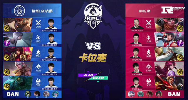 JRS直播网讯 5月11日2021KPL春季赛常规赛第八周第一日第二场A/B卡位赛,由A组杭州LGD大鹅对阵B组RNG.M,以下是本场比赛快讯。
