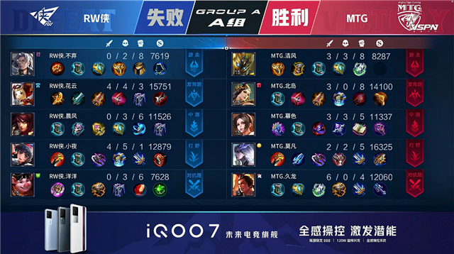 双方常规开局,1分12秒MTG拿下中路河道之灵。2分15秒RW侠击杀娜可露露拿到一血并拿下暴君。3分23秒RW侠中路击杀王昭君。5分35秒中路团战RW侠打出0换3。6分11秒野区团战RW侠击杀娜可露露。7分27秒RW侠摧毁敌方上路二塔。7分49秒RW侠拿下暴君。7分58秒MTG拿下主宰。8分20秒RW侠中路击杀王昭君。8分33秒RW侠摧毁敌方西路二塔。8分42秒RW侠打出0换2并摧毁敌方下路高地塔。9分10秒RW侠摧毁敌方水晶拿下比赛。