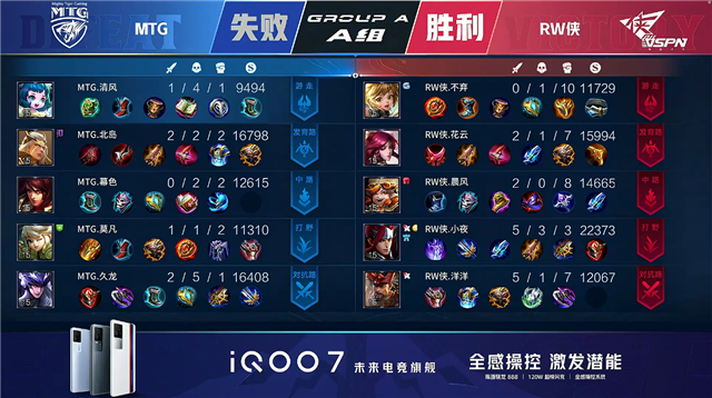 开局双方互相入侵野区,RW侠反到蓝BUFF并守住己方蓝BUFF。2分22秒暴君处团战RW侠打出0换3,MTG拿下暴君。3分22秒RW侠中路击杀猪八戒。3分57秒RW侠上路击杀露娜。4分23秒RW侠下路打出0换3,公孙离拿到三连决胜。5分38秒RW侠上路击杀露娜。5分52秒RW侠下路1换1。6分10秒RW侠摧毁敌方中路外塔。6分37秒RW侠拿下暴君。8分02秒MTG中路反杀不知火舞。8分27秒RW侠拿下主宰。9分46秒RW侠越塔击杀露娜并摧毁上路二塔。10分17秒RW侠拿下暗影暴君。11分13秒RW侠主宰处击杀太乙真人。11分58秒RW侠橘右京下路单杀露娜。12分27秒RW侠中路打出1换2。12分59秒RW侠拿下暗影主宰。14分34秒上路团战RW侠打出1换3,关羽拿到二连击破。14分56秒RW侠摧毁敌方下、中高地塔。15分04秒RW侠摧毁敌方水晶拿下比赛。