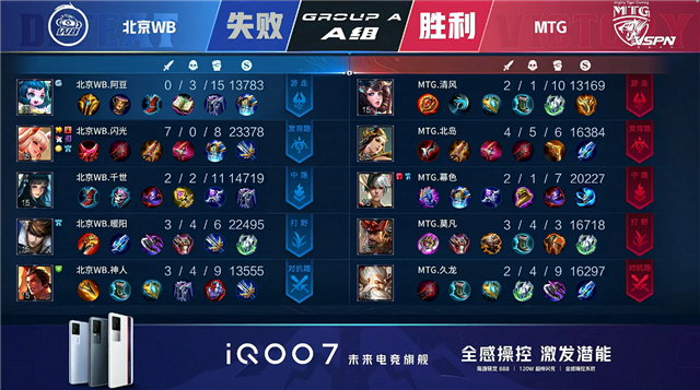 开局MTG入侵野区击杀沈梦溪拿到一血,1分10秒MTG拿下中路河道之灵。2分14秒MTG拿下暴君。3分27秒MTG中路反杀东皇太一。4分40秒下路团战MTG击杀东皇太一。5分32秒MTG拿下暴君,北京WB猪八戒与MTG赵云1换1,下路双方游走互换。6分35秒双方中路游走互换。7分01秒北京WB摧毁上路外塔。7分34秒北京WB下路打出0换2。9分17秒中路团战北京WB击杀盾山并摧毁敌方中路外塔。10分06秒上路团战双方2换2。11分04秒MTG下路击杀赵云。11分33秒MTG摧毁敌方中路外塔。12分46秒暴君处团战MTG打出2换4。13分28秒MTG摧毁敌方下路二塔。13分53秒MTG拿下暗影主宰。15分25秒野区团战双方1换1。16分35秒暴君处团战MTG打出2换5,周瑜拿到三连决胜,关羽拿到二连击破。17分04秒MTG摧毁敌方水晶拿下比赛。