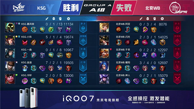北京WB3Buff开局。47秒周瑜击杀吕布拿下一血。2分15秒北京WB抢下先知主宰,团战打出0换4,澜拿下三杀。5分钟下路团双方打出3换3,北京WB拆掉KSG下路一塔。7分44秒北京WB拿下先知主宰,拆掉KSG中路一塔,8分50秒中路团北京WB击杀不知火舞。9分05秒北京WB拆掉KSG下路二塔,9分20秒下路团KSG打出0换2。10分钟KSG拆掉北京WB中路一塔并击杀周瑜,10分23秒KSG拿下暗影暴君,11分钟KSG拿下暗影主宰。14分50秒团战KSG击杀周瑜,15分45秒KSG拿下暗影暴君,16分钟团战KSG击杀澜。17分40秒团战KSG打出0换2,18分28秒KSG击杀周瑜拆掉北京WB上路高地。18分58秒KSG拆掉北京WB中路高地,19分20秒KSG一波拆掉北京WB水晶拿下本局胜利。