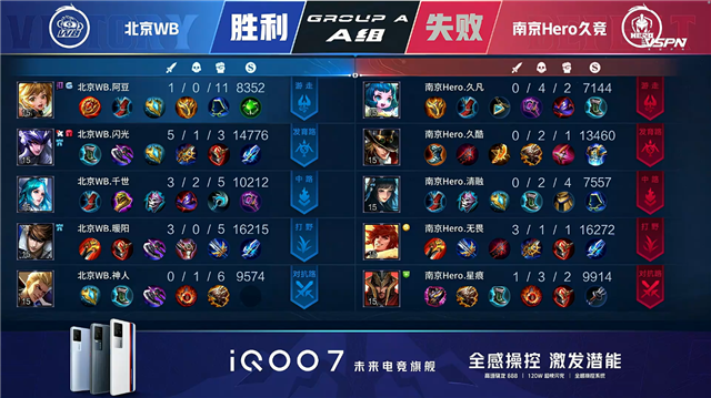 开局南京Hero选择野区入侵未果。1分11秒南京Hero拿下中路河道之灵。2分44秒中路团战南京Hero击杀嫦娥拿到一血。3分27秒北京WB中路击杀不知火舞。3分56秒南京Hero镜中路单杀嫦娥。6分27秒暴君处团战双方1换1。6分50秒南京Hero拿下暴君。6分57秒北京WB拿下主宰。8分13秒野区双方1换1。9分29秒北京WB摧毁敌方中路外塔。10分03秒北京WB下路击杀镜。10分37秒北京WB暴君处击杀牛魔并拿下暗影暴君。11分15秒北京WB上路击杀百里守约。11分43秒北京WB摧毁敌方中路二塔。12分27秒野区北京WB打出1换2。12分58秒北京WB拿下暗影主宰。14分30秒北京WB上路击杀不知火舞。14分54秒北京WB摧毁敌方上路高地塔。15分11秒北京WB摧毁敌方中路外塔。15分28秒北京WB拿下暗影暴君。16分23秒下路团战北京WB打出0换4。16分55秒北京WB摧毁敌方水晶拿下比赛。