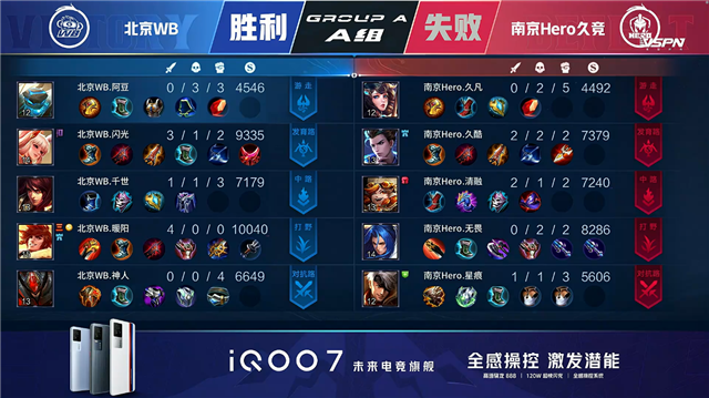 双方平稳开局,南京Hero马可波罗走到对抗路对线马超。1分51秒南京Hero中路击杀王昭君拿到一血。2分21秒北京WB上路击杀蒙恬。3分02秒北京WB拿下暴君,南京Hero拿下主宰。3分15秒上路团战双方1换1。4分42秒北京WB摧毁敌方上路外塔。5分55秒北京WB摧毁敌方下路外塔。6分58秒中路团战南京Hero击杀狂铁。7分19秒南京Hero拿下暴君。8分40秒野区团战北京WB打出0换2,马超拿到二连击破。10分35秒北京WB拿下暗影主宰。13分28秒野区团战北京WB打出0换3。13分55秒北京WB摧毁敌方中路二塔。15分12秒北京WB拿下暗影暴君、南京Hero拿下暗影主宰。19分14秒上路团战北京WB打出1换4。19分52秒北京WB摧毁敌方水晶拿下比赛。