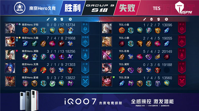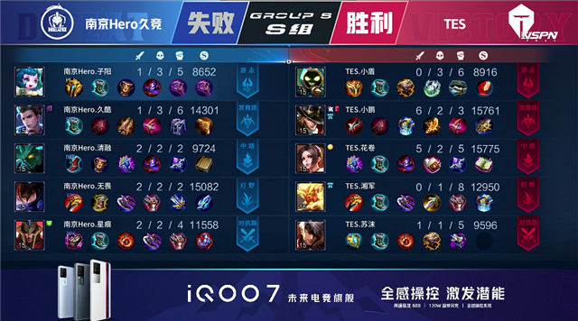 2分16秒,南京Hero拿下暴君。4分40秒,下路团,双方2换2,马可波罗拿下双杀。5分10秒,南京Hero破掉TES下一塔。7分07秒,南京Hero破掉TES中一塔。7分44秒,中路团,南京Hero击杀马可波罗。8分11秒,南京Hero破掉TES下二塔。9分48秒,TES拿下先知主宰。10分47秒,TES抢下暗影暴君,随后团战TES打出1换4,不知火舞与马可波罗拿下双杀。11分27秒,TES下路击杀墨子团灭对手,随后破掉南京Hero中路高地。12分28秒,TES不知火舞击杀澜,随后控下暗影主宰。15分09秒,TES拿下暗影暴君。16分12秒,TES破掉南京Hero上高地。16分35秒,南京Hero击杀盘古。17分20秒,南京Hero墨子击杀不知火舞。17分50秒,南京Hero拿下暗影主宰。19分27秒,南京Hero澜击杀太乙真人。19分58秒,TES中路反打打出1换4。20分35秒,TES破掉南京Hero水晶拿下胜利。
