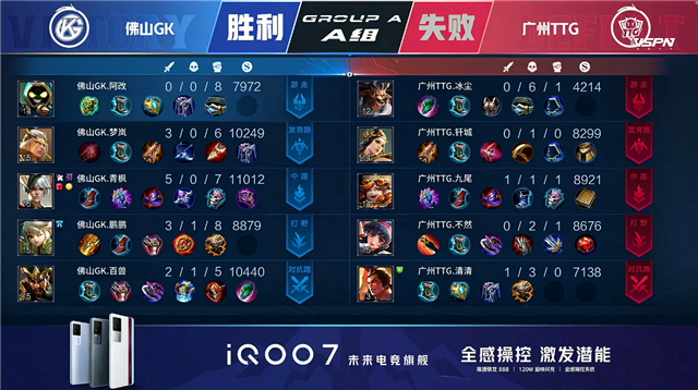 开局佛山GK入侵野区佛山GK打出1换2拿下一血,并反掉蓝BUFF。1分14秒广州TTG拿下中路河道之灵。2分22秒广州TTG拿下暴君。3分12秒佛山GK野区击杀橘右京。6分18秒佛山GK中路击杀张飞。6分37秒佛山GK击杀不知火舞并摧毁中路外塔。6分57秒佛山GK上路击杀马超。7分11秒广州TTG拿下暴君。8分07秒佛山GK下路击杀橘右京。9分11秒佛山GK上路击杀橘右京。10分18秒佛山GK拿下暗影暴君,广州TTG拿下暗影主宰。15分06秒佛山GK拿下暗影暴君。15分37秒佛山GK拿下暗影主宰。16分24秒野区团战佛山GK打出1换3。16分41秒佛山GK摧毁敌方水晶拿下比赛。