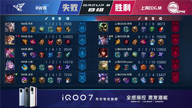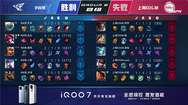 双方和平开局,1分31秒上海EDG.M娜可露露上路击杀白起拿下一血,2分11秒上海EDG.M拿下第一条暴君。3分09秒野区团上海EDG.M打出0换2,4分20秒RW侠拆掉上海EDG.M中路一塔,上海EDG.M反打0换3。6分05秒RW侠大乔被击杀,7分23秒上海EDG.M中路击杀周瑜。8分55秒中路团战上海EDG.M打出0换4,9分18秒上海EDG.M带领兵线拆掉RW侠下路高地,RW侠白起复活但无力防守,被一波拆掉水晶。