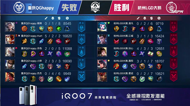 吕布反掉杭州LGD红buff,重庆QG三buff开局。2分13秒,重庆QG拿下暴君。4分57秒,先知主宰团,杭州LGD打出1换2。5分30秒,杭州LGD破掉重庆QG上一塔。6分钟,杭州LGD下路越塔击杀鲁班七号。10分31秒,重庆QG拿下黑暗暴君,随后杭州LGD拿下主宰。12分10秒,中路团,重庆QG打出2换5,鲁班七号拿下三杀。12分53秒,重庆QG一波破掉杭州LGD中路三塔。14分47秒,重庆QG再次控下黑暗暴君。16分11秒,重庆QG击杀上官婉儿。16分53秒,重庆QG强推掉杭州LGD下二塔。17分11秒,杭州LGD秒掉鲁班七号。17分50秒,杭州LGD破掉重庆QG中二塔后拿下主宰。19分02秒,重庆QG拿下黑暗暴君,但杭州LGD击杀吕布。20分17秒,杭州LGD拿下风暴龙王,随后击杀吕布。21分钟,杭州LGD破掉重庆QG上高地并击杀赵云。21分44秒,杭州LGD高地强冲一波摧毁重庆QG水晶。