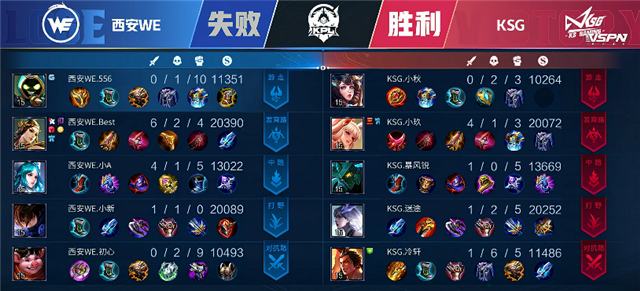 双方平稳开局。2分19秒KSG拿下主宰。2分58秒中路河道处团战,西安WE打出1换2,镜拿下一血。4分40秒,双方互换边路一塔。5分钟中路下河道团战,冷轩被击杀。6分钟KSG拿下主宰,同时爆发团战,猪八戒被击杀。6分50秒KSG入侵红区,张飞被击杀。6分58秒中路团战,双方1换1。8分36秒,橘右京拿下暴君。10分37秒橘右京拿下主宰。11分35秒KSG击杀初心并推掉中路一塔。12分13秒,中路二塔处团战,KSG打出0换2。13分钟KSG推掉上路高地塔。14分22秒KSG强推高地打出1换2,并顺势推掉中路和下路高地塔。15分20秒,橘右京拿下主宰。16分20秒西安WE高地处团战KSG打出1换3。16分37秒KSG攻破水晶拿下本场比赛胜利。