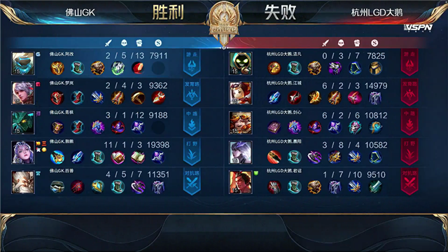 1分01秒杭州LGD大鹅击杀老夫子拿下一血,2分20秒下路团双方2换2。4分10秒团战双方1换1,4分53秒团战双方1换1。5分10秒佛山GK拆掉杭州LGD大鹅下路一塔,5分51秒佛山GK击杀吕布。6分30秒团战佛山GK1换2,下路佛山GK露娜单杀镜,拆掉杭州LGD大鹅下路二塔。9分14秒下路团,佛山GK击杀镜,10分20秒佛山GK拿下暗影暴君,10分50秒佛山GK拿下暗影主宰。11分28秒团战佛山GK打出1换3,拆掉杭州LGD大鹅中路二塔。12分钟佛山GK拆掉杭州LGD大鹅中路高地,杭州LGD大鹅打出1换2。14分05秒团战杭州LGD大鹅打出1换2,15分25秒团战杭州LGD大鹅拿下暗影暴君,双方1换1。17分21秒佛山GK击杀沈梦溪,17分58秒团战佛山GK打出2换4,露娜拿下三杀。18分23秒佛山GK击杀沈梦溪,一波拆掉水晶拿下胜利。
