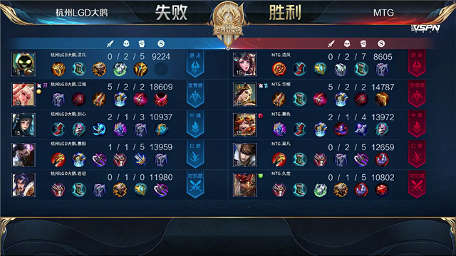 双方平稳开局,2分15秒杭州LGD大鹅拿下暴君,5分钟下路团杭州LGD大鹅打出0换3,拆掉MTG下路一塔。8分30秒团战杭州LGD大鹅打出0换3,拆掉MTG中路一塔。9分14秒杭州LGD大鹅拆掉MTG上路二塔,10分25秒杭州LGD大鹅击杀廉颇,10分46秒杭州LGD大鹅拿下暗影暴君。13分30秒杭州LGD大鹅拆掉MTG中路二塔,16分15秒杭州LGD大鹅拆掉MTG上路高地,MTG打出0换2。16分40秒MTG拿下暗影主宰,20分10秒团战MTG打出0换3。21分钟MTG拆掉杭州LGD大鹅中路高地,团灭杭州LGD大鹅拿下胜利。