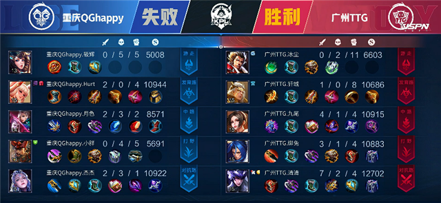 开局猪八戒入侵蓝区拿下蓝buff。2分11秒,小胖马超在中路拿下一血。2分47秒,广州TTG拿下暴君,上路重庆QGhappy杰杰蒙恬击杀九尾姜子牙。3分47秒中路上河道爆发团战,姜子牙被击杀。4分40秒下河道团战,孙膑被击杀。5分08秒,狄仁杰击杀西施并推掉下路一塔。6分37秒广州TTG入侵蓝区,小胖被击杀。7分27秒重庆QGhappy拿下主宰,广州TTG推掉中路一塔,双方河道团战,重庆QGhappy打出0换2。8分40秒,下路一塔处爆发团战,重庆QGhappy打出0换2。10分18秒上河道团战,清清被击杀,重庆QGhappy顺势拿下主宰。12分20秒重庆QGhappy强攻上路二塔打出1换2,蒙恬拿下双杀。13分30秒重庆QGhappy拿下暴君。14分40秒重庆QGhappy推掉上路高地塔。15分03秒重庆QGhappy拿下主宰。15分20秒下路二塔处团战,绑兔被击杀。16分58秒重庆QGhappy推掉下路高地塔。17分30秒,野区红buff旁爆发团战,广州TTG打出1换3。18分45秒广州TTG拿下暴君。19分54秒重庆QGhappy中路二塔处团战,广州TTG打出1换3。21分10秒广州TTG拿下风暴龙王。22分47秒,重庆QGhappy下路二塔被推掉。24分45秒上河道团战,蒙恬被击杀。26分钟广州TTG拿下风暴龙王。27分20秒广州TTG推掉上路高地塔。27分47秒广州TTG推掉下路高地塔,同时爆发团战,广州TTG打出2换3。30分30秒重庆QGhappy强开,双方打出1换1。32分40秒风暴龙王团,猪八戒拿下风暴龙王,广州TTG打出0换4。广州TTG顺势一波直推水晶,在33分17秒广州TTG赢得本局比赛胜利。