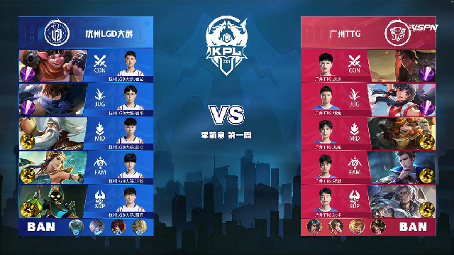 双方平稳开局,1分10秒杭州LGD大鹅中路击杀吕布拿到一血。1分57秒双上上路1换1。2分35秒广州TTG拿下暴君。2分50秒杭州LGD大鹅上路击杀吕布。5分18秒杭州LGD大鹅澜中路下河道一打三完成二连击破。5分52秒杭州LGD大鹅摧毁敌方下路外塔。6分07秒杭州LGD大鹅下路击杀沈梦溪。6分40秒杭州LGD大鹅摧毁敌方中路外塔。7分01秒广州TTG拿下暴君。7分12秒杭州LGD大鹅摧毁敌方上路外塔。7分46秒杭州LGD大鹅虞姬下路单杀娜可露露。8分05秒下路团战广州TTG打出0换2,8分34秒广州TTG中路击杀太乙真人。8分51秒广州TTG中路击杀姜子牙并摧毁中路外塔。9分15秒广州TTG摧毁敌方上路外塔。9分44秒广州TTG拿下主宰。10分35秒暴君处团战杭州LGD大鹅打出0换2,广州TTG拿到暗影暴君。11分09秒杭州LGD大鹅摧毁敌方中路二塔。12分01秒中路团战杭州LGD大鹅打出0换2。12分27秒杭州LGD大鹅摧毁敌方中路高地塔。13分18秒杭州LGD大鹅拿下暗影主宰。15分整杭州LGD大鹅拿下暗影暴君。15分51秒杭州LGD大鹅摧毁敌方上路二塔。16分08秒杭州LGD大鹅虞姬上路击杀娜可露露。16分24秒高地团战杭州LGD大鹅打出0换3并摧毁水晶。