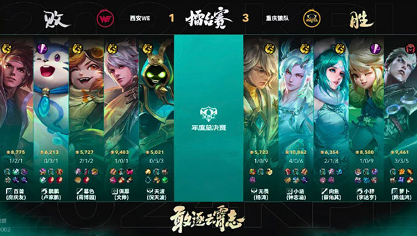第三局,WE开局反蓝击杀小胖的杨玉环取得优势,十分钟龙团打赢团战扳回局面,他们紧盯马超,团灭重庆狼队,佩恩的孙尚香发挥出色,荣获本局MVP。