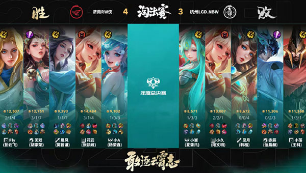 第五局,开局阶段,杭州LGD.NBW双边发育较为平缓。但在中间的一波团战中,济南RW侠的Fly使用亚连和无双使用大司命,通过一波精彩的蹲草操作,成功打出节奏点。在最后一波关键团战中,RW侠无双的大司命如天神下凡,状态无敌,配合队友迅速包围杭州LGD.NBW,打了一波猝死团。恭喜济南RW侠再下一城,率先来到赛点!本局MVP为RW侠无双(胡家荣),他的大司命在团战中的输出和控制,为队伍带来了胜利的曙光。