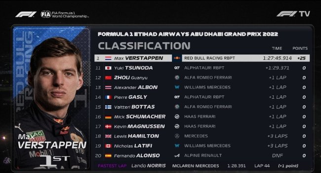 2022年F1阿布扎比大奖赛正赛成绩表: