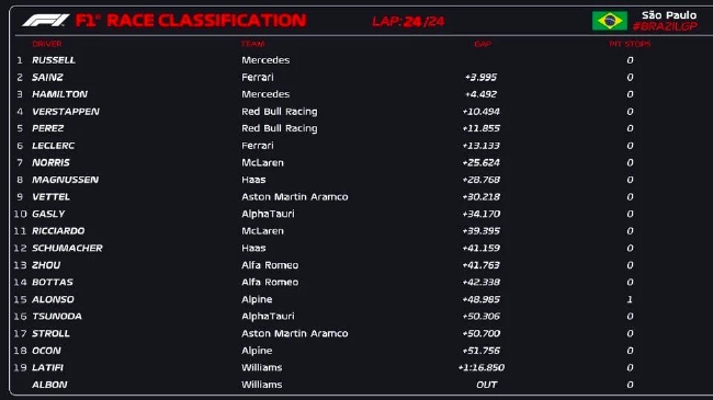 拉塞尔生涯首次取得冲刺赛头名,塞恩斯第二!汉密尔顿从第八位发车追到第三。维斯塔潘和佩雷兹分列四五位,勒克莱尔第六,诺里斯第七,杆位发车的马格努森最终排在第八。前八位车手都将有积分入账!