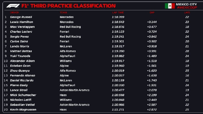 2022年F1墨西哥大奖赛第3练习赛成绩表: