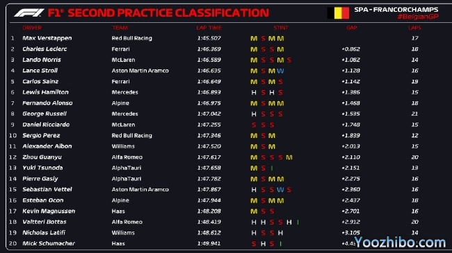 2022年F1比利时大奖赛第2次练习赛成绩表: