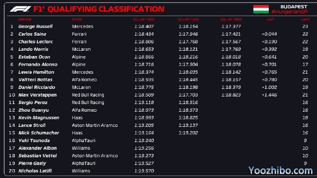 JRS直播网讯 2022年F1匈牙利大奖赛排位赛在亨格罗宁赛道结束,梅赛德斯车队拉塞尔Q3最后一个飞驰圈刷新成绩,超越法拉利车手塞恩斯,拿到F1生涯首个杆位!这也是梅赛德斯车队本赛季首个杆位!塞恩斯第二,他的队友勒克莱尔第三。