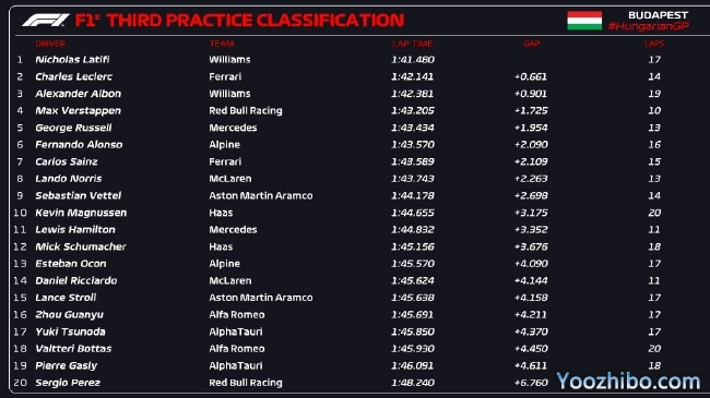 JRS直播网讯 2022年F1匈牙利大奖赛第3次练习赛在亨格罗宁赛道结束,整个三练在雨中进行,随着在最后阶段赛道条件逐渐变好,威廉姆斯车队拉提菲在最后时刻做出1:41.480的成绩,拿到三练头名。法拉利车队勒克莱尔落后0.661秒排名第二,另一位威廉姆斯车手阿尔本第三!