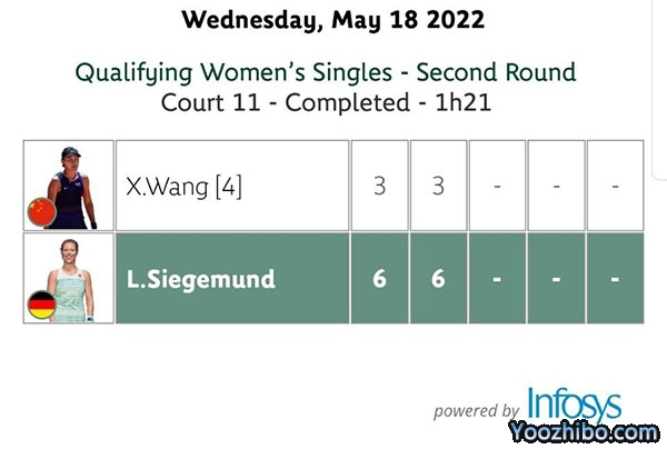 进入第二盘,西格蒙德保持了首盘的稳定表现,而王曦雨并不是最佳状态,德国老将凭借两次破发得手,建立起5-1的领先。虽然王曦雨连破带保把比分追至3-5,但西格蒙德在第二个发球胜赛局顺利保发,最终以6-3锁定胜局,总比分2-0战胜王曦雨,跻身决胜轮。