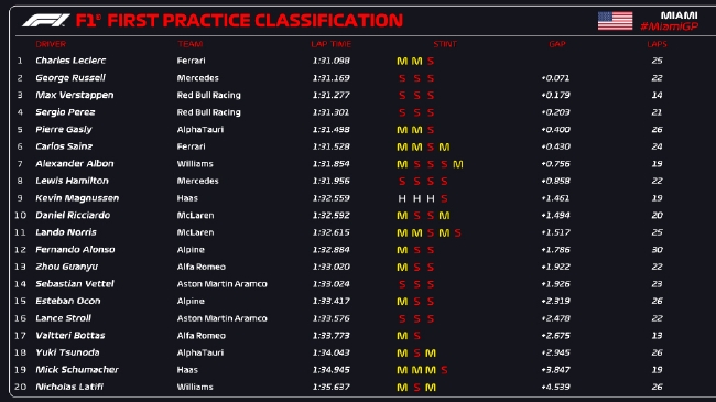 2022年F1迈阿密大奖赛第1次练习赛成绩表: