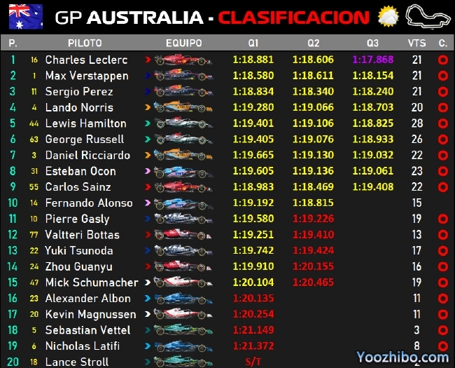 JRS直播网讯 2022年F1澳大利亚大奖赛排位赛4月9日下午在墨尔本赛道结束。法拉利车队勒克莱尔与红牛车队维斯塔潘Q3最后时刻先后刷新成绩,最终勒克莱尔做出1:17.868,拿到本赛季个人第二个杆位!维斯塔潘和佩雷兹分列二三位!