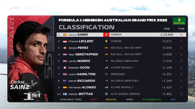 JRS直播网讯 :北京时间4月8日下午,2022年F1澳大利亚大奖赛第1次练习赛在墨尔本赛道结束。前四名被法拉利和红牛包揽:塞恩斯1:19.806位列第一,队友勒克莱尔落后0.571秒排名第二;佩雷兹和维斯塔潘分列三四,前四名车手差距在1秒之内。