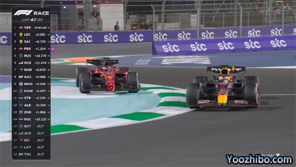 与前一场巴林大奖赛类似,沙特站依然呈现红牛与法拉利两支车队争霸的局面。排位赛中,红牛的佩雷兹在最后时刻压过上站冠军勒克莱尔,抢下杆位,塞恩斯与维斯塔潘紧随其后。正赛中,四台赛车依然优势明显,不过由于赛场内事故频发,导致安全车与虚拟安全车先后出动,佩雷兹的领先优势很快消耗殆尽,被另外三人陆续超越。