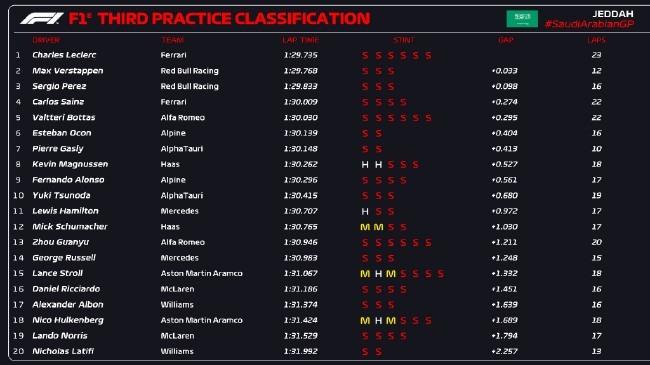 JRS直播网讯 2022年F1沙特大奖赛第3次练习赛在吉达赛道结束,法拉利车队勒克莱尔在最后一个飞驰圈做出1:29.768,拿到三练头名;红牛车队维斯塔潘落后0.033秒位列第二,佩雷兹第三;另一位法拉利车手塞恩斯第四。