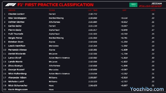 2022年F1沙特大奖赛第1次练习赛成绩表:
