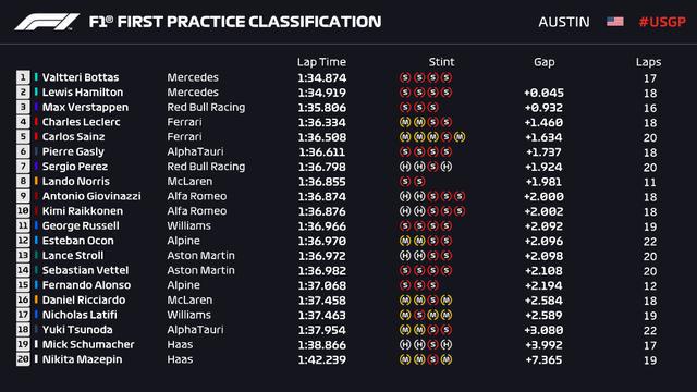 最终,博塔斯一练最快,汉密尔顿落后0.045秒排在第二,维斯塔潘落后0.932秒,排在第三。
