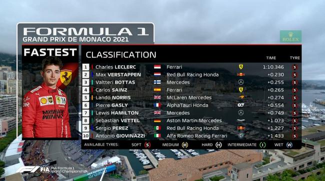 JRS直播网讯 北京时间5月22日晚,2021F1摩纳哥大奖赛排位赛结束。经过1个多小时的比拼,尽管因为撞墙引发红旗导致排位赛提前结束,但法拉利车手勒克莱尔还是以1分10秒346的成绩,在主场拿下了赛季首个杆位,维斯塔潘落后0.230秒排名第二,博塔斯落后0.255秒排名第三。P4-P10分别为:塞恩斯、诺里斯、加斯利、汉密尔顿、维特尔、佩雷兹和吉奥维纳兹。正赛将在北京时间23日晚21点开始。