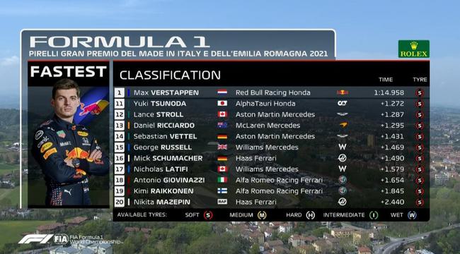 最终,经过一个小时,维斯塔潘做出1分14秒958位列第一,诺里斯落后0.456秒排名第二,汉密尔顿排在第三,落后维斯塔潘0.557秒。佩雷兹第四,勒克莱尔第五,加斯利、塞恩斯、博塔斯、阿隆索、奥康分列第六至第十位。